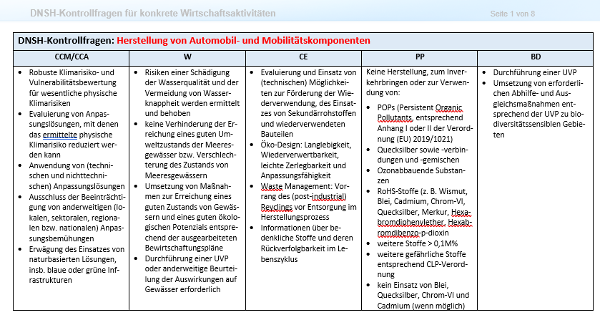 Zwei Anhänge bieten vertiefende Einblicke in die Anforderungen an taxonomiekonforme Wirtschaftsaktivitäten und in das DNSH-Prinzip zur Vermeidung erheblicher Beeinträchtigungen. Arbeitshilfen: von: |