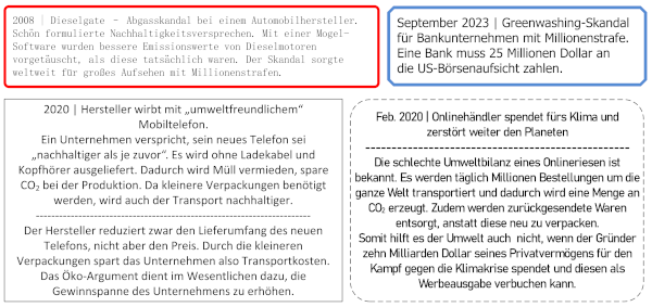 Wenn die Täuschungsmanöver Greenwashing aufgedeckt werden, drohen den Unternehmen oft sehr hohe Strafen. Anbei finden Sie eine Auflistung von allgemeinen Greenwashing-Folgen, die in den letzten Jahren für Schlagzeilen sorgten (s. auch Abb. 3):
