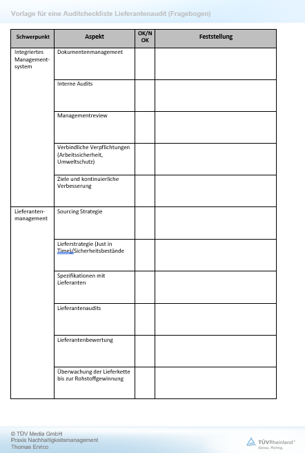 Für die Steuerung der Lieferantenaudits bedeutsam sind die Umweltaspekte und die damit einhergehenden Umweltauswirkungen, die Risiken bei der Herstellung des Produkts oder der Dienstleistung beim Lieferanten sowie bindende Verpflichtungen des Zertifikatshalters „... wie z. B. geltende Gesetze und Vorschriften, oder aus freiwilligen Verpflichtungen, wie z. B. Organisations- und Branchenstandards... ” [ISO 14001:2015 Anmerkung 29]. Das Audit bietet hier die Möglichkeit, die Situation bezüglich der Umweltaspekte/-auswirkungen vor Ort beim Lieferanten zu überprüfen. Zum anderen hat die Organisation einen rechtssicheren Betrieb sicherzustellen. Dies beinhaltet sowohl die Tätigkeiten von Dienstleistern am Kundenstandort, z. B. Reinigungsfirmen, als auch Entsorgungsdienstleistungen, z. B. von Abfällen. Speziell die Pflichten des Abfalleigentümers enden erst mit dem sachgerechten Ende der Abfalleigenschaften, sodass rechtliche Verstöße des Abfallentsorgers auf den Hersteller zurückfallen können. Hier bieten Lieferantenaudits die Möglichkeit, Verfehlungen der Dienstleister rechtzeitig aufzudecken.