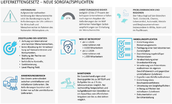 Also bestand Handlungsbedarf, dem die Bundesregierung mit dem Lieferkettensorgfaltspflichtengesetz (die korrekte Bezeichnung lautet: Gesetz über die unternehmerischen Sorgfaltspflichten in Lieferketten) nachgekommen ist. Das Gesetz und die daraus resultierenden Anforderungen für Unternehmen werden in den folgenden beiden Abschnitten vorgestellt.