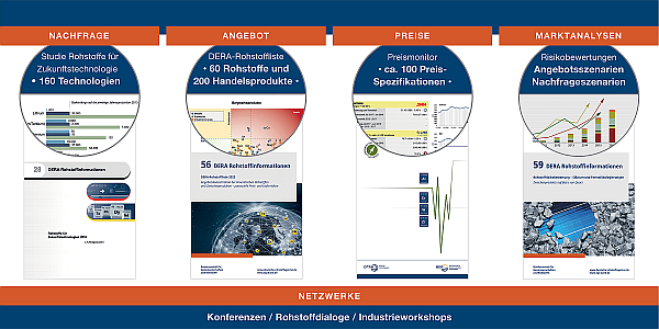 Mit ihren Studien und Pilotprojekten zeigt die DERA Preis- und Lieferrisiken sowie neue Rohstoffpotenziale bei mineralischen Rohstoffen und Recyclingrohstoffen auf. Durch nationale und internationale Kooperationen auf staatlicher und wirtschaftlicher Ebene baut sie Netzwerke auf, insbesondere mit rohstoffreichen Ländern. Ihre Publikationen stellt die DERA kostenlos zur Verfügung und führt in regelmäßigen Abständen Industrieworkshops zu ausgewählten Themen durch.