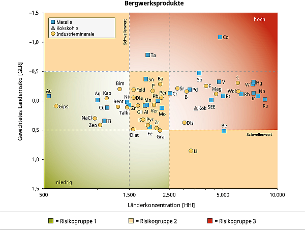 Auf der Angebotsseite beleuchtet die DERA-Rohstoffliste die potenziellen Preis- und Lieferrisiken für 64 Rohstoffe und 221 Handelsprodukte. Bewertet werden die Marktkonzentration auf Anbieterseite und das Länderrisiko der Hauptförderländer, die sich beide auf die Verfügbarkeit und damit den Marktpreis der Rohstoffe auswirken können. In der aktuellen DERA-Rohstoffliste 2023 [4] sind insgesamt 36 Metalle, 27 Industrieminerale, dazu Kokskohle sowie 221 Handelsprodukte aufgeführt.